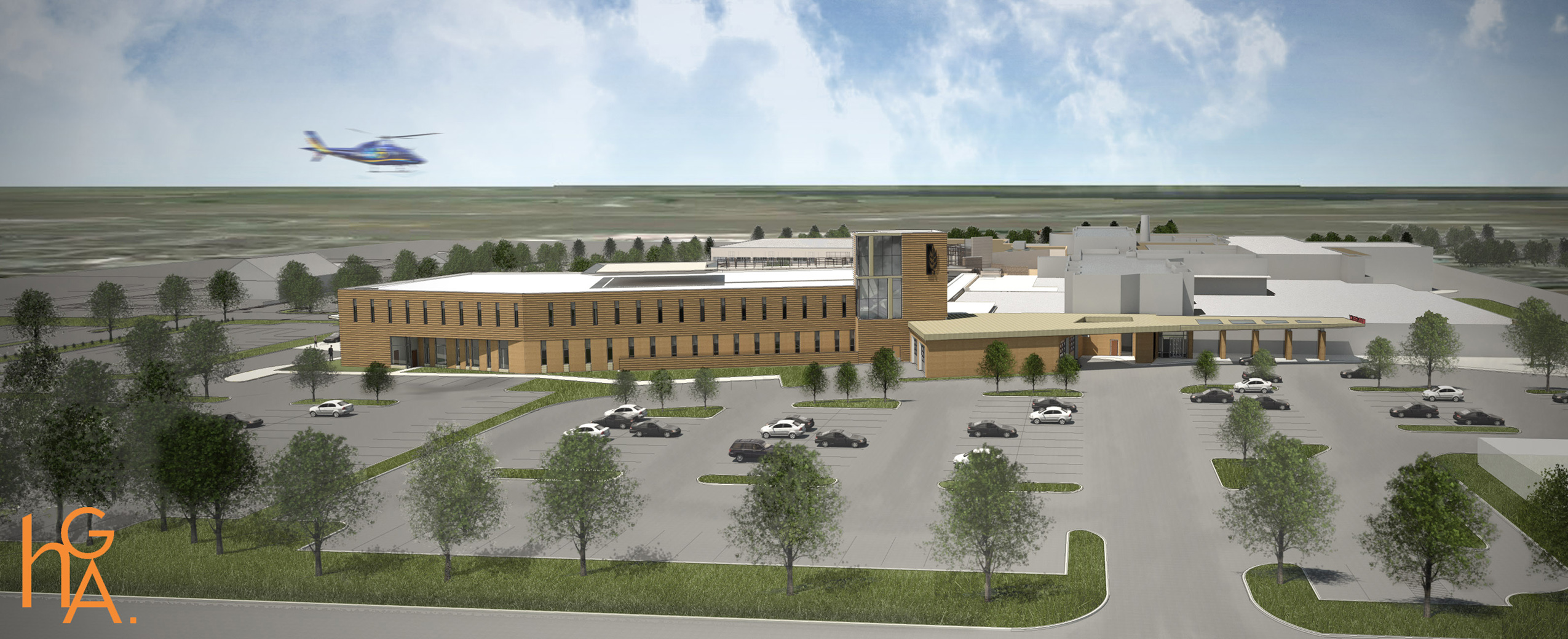 The future Prairie Lakes Specialty Clinic, looking north. You can see the current hospital main entrance to the left. A glass walk way will connect the clinic to the hospital, shown in more detail below.